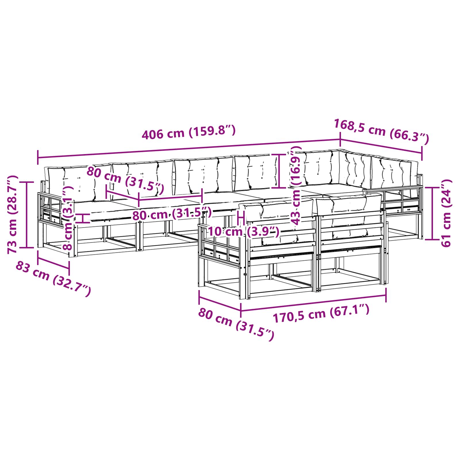 • 8 x Sedací polštář: 80 x 80 x 8 cm (D x Š x V)