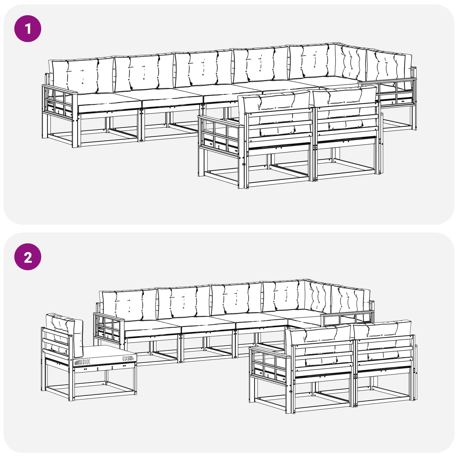 • Modulární flexibilita: Upravte rozložení soupravy na míru různým událostem nebo potřebám prostoru. Tato vlastnost je super pro počet hostů, které máte, a pro změny počasí. Umožňuje snadné přizpůsobení uspořádání.
