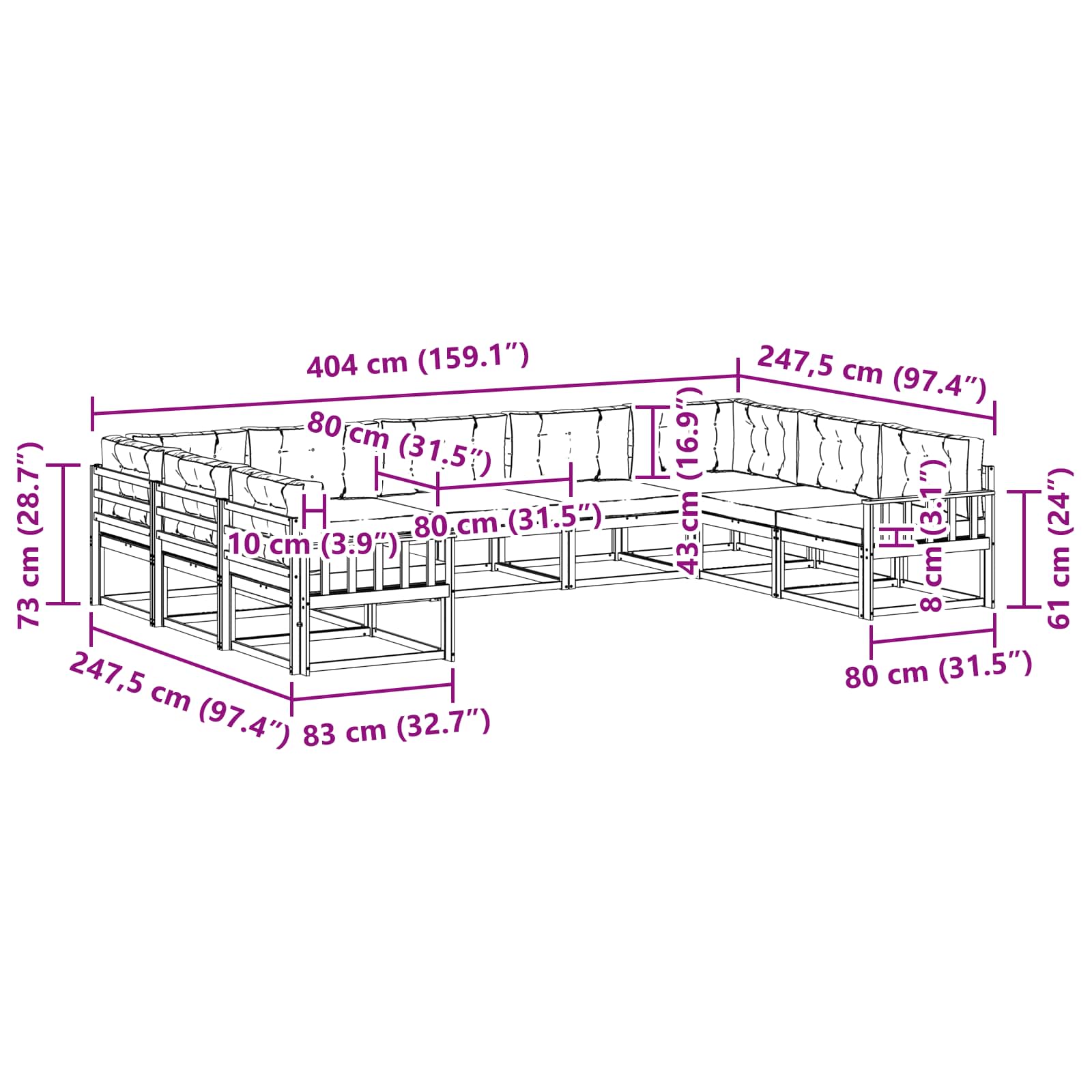 • 9 x sedací polštář: 80 x 80 x 8 cm (D x Š x V)