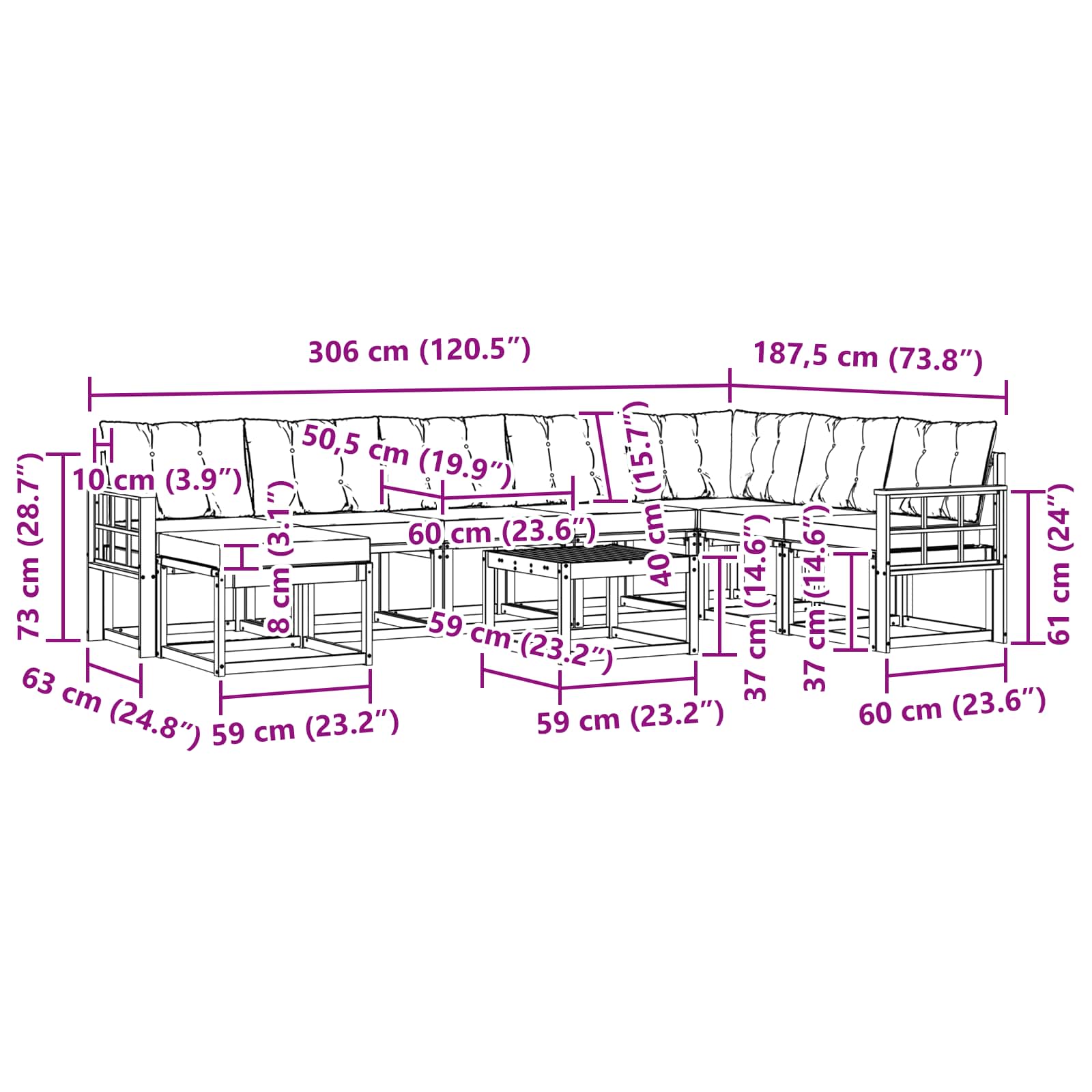 • 6 x Středová pohovka: 59 x 63 x 73 cm (D x Š x V)