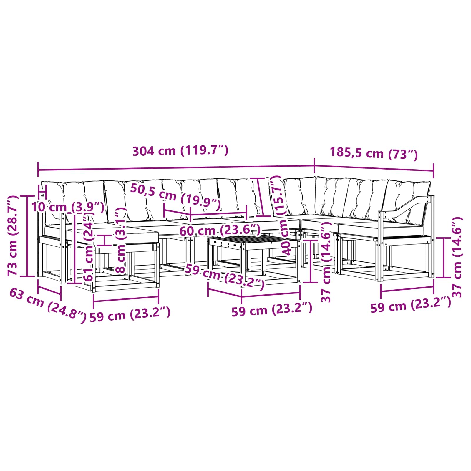 • 6 x Středová pohovka: 59 x 63 x 73 cm (D x Š x V)