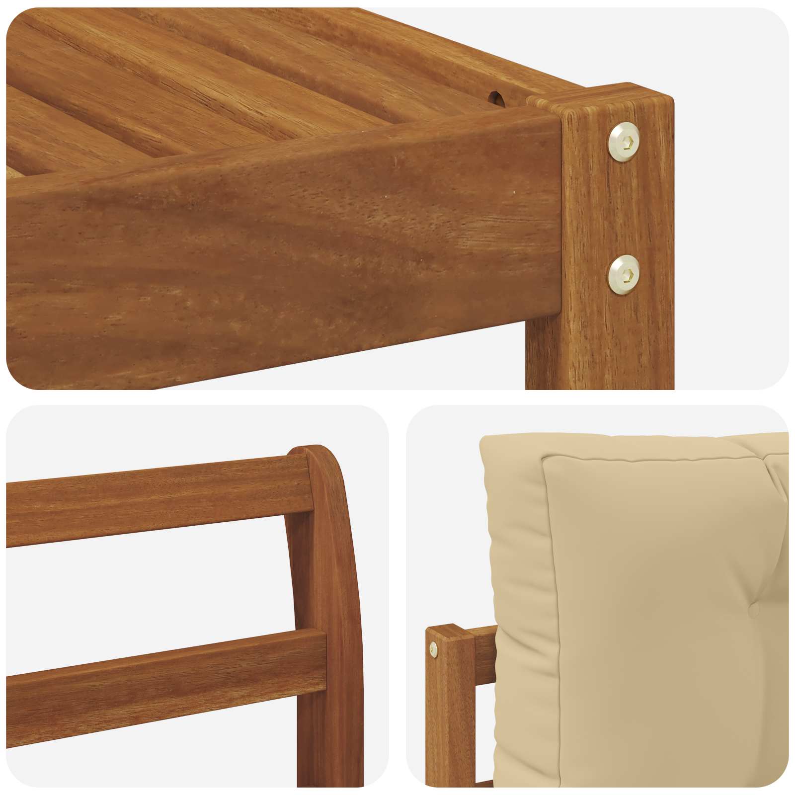 • Materiály: Tato sedačka je z masivního akáciového dřeva, což zaručuje, že je spolehlivá a vypadá krásně v každém venkovním prostoru. Dřevo je odolné, takže vydrží i časté používání venku bez hrudek nebo prasklin. Hladký povrch dodává šmrnc.