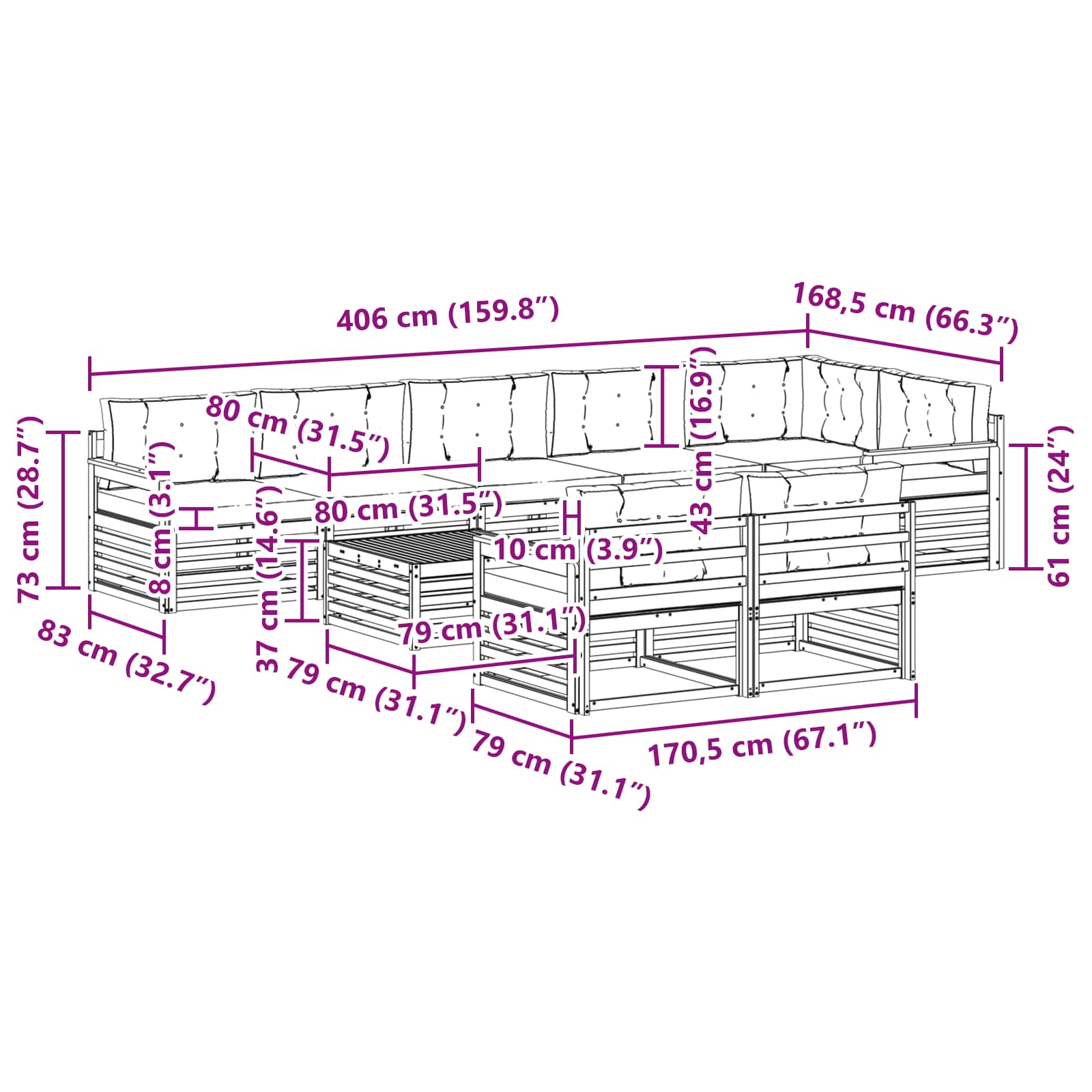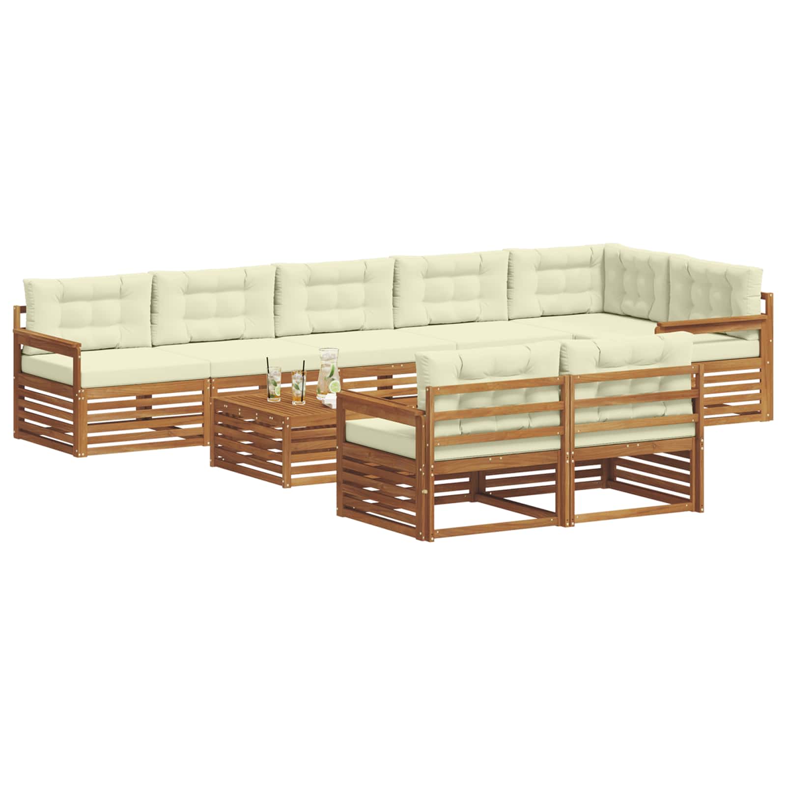 Tato venkovní souprava nábytku kombinuje styl a funkčnost a vytváří tak úžasný středobod na vaší zahradě nebo terase. Moderní design s čistými liniemi a jednoduchými detaily dodává eleganci a zároveň podporuje relaxaci i společenské akce venku. Celá je vyrobená z masivního akáciového dřeva, což zajišťuje trvanlivost a stálou vizuální krásu, ideální pro ty, kteří chtějí praktický a zároveň elegantní venkovní nábytek.