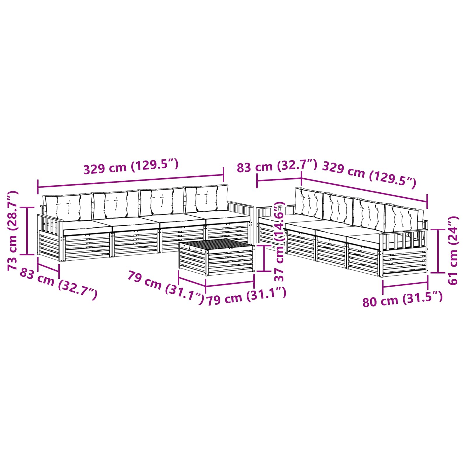 • 8 x Střední pohovka: 79 x 83 x 73 cm (D x Š x V)
