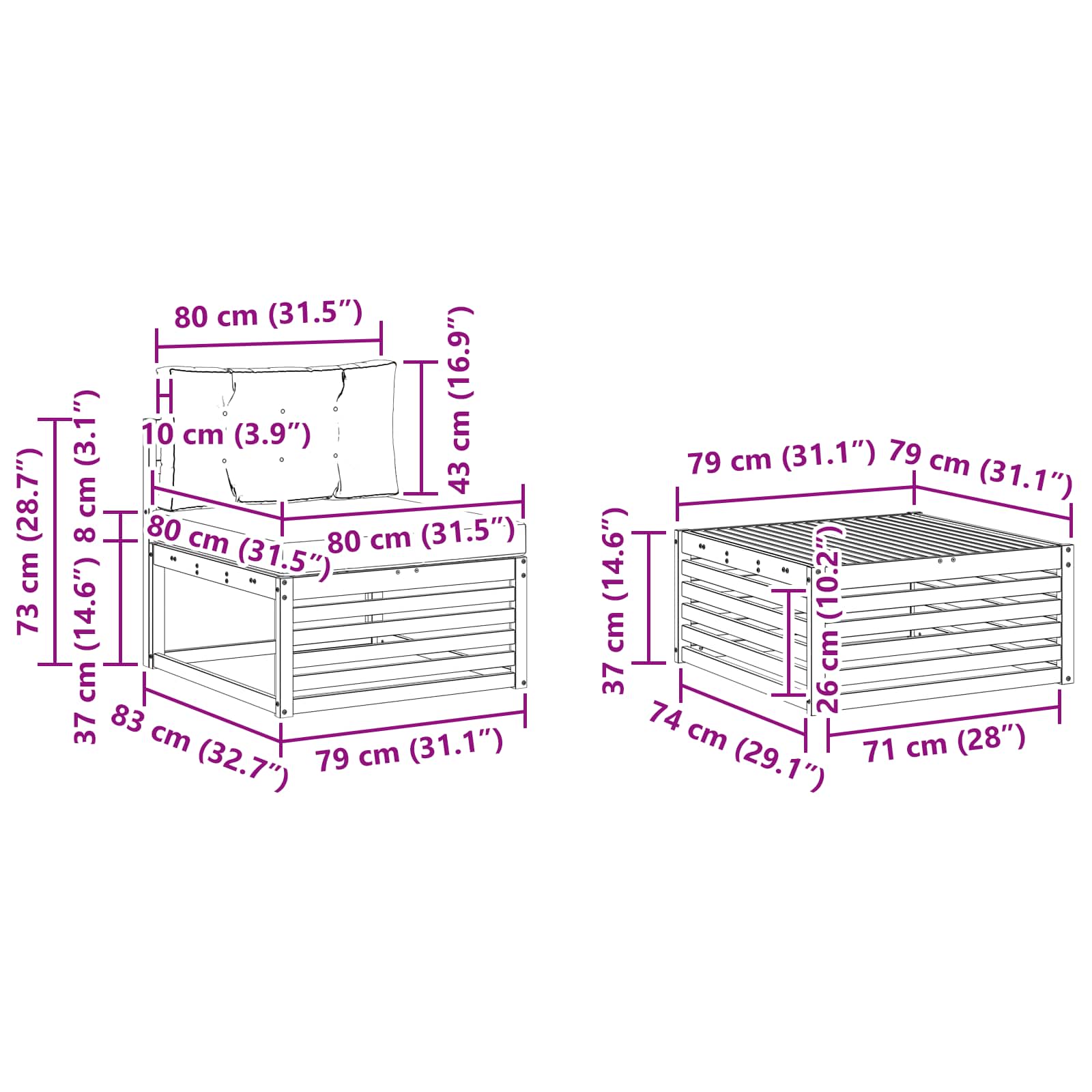 • 8 x Střední pohovka: 79 x 83 x 73 cm (D x Š x V)