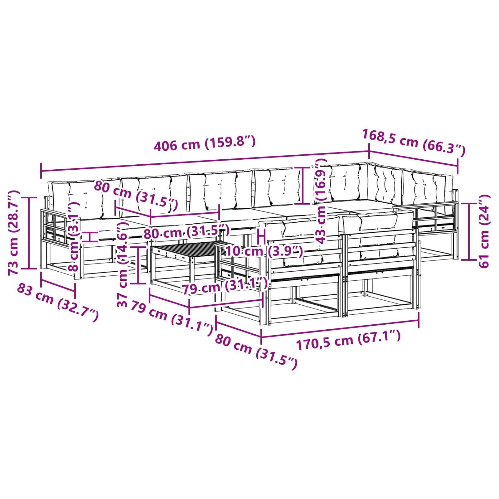 • 8 x Sedací polštář: 80 x 80 x 8 cm (D x Š x V)