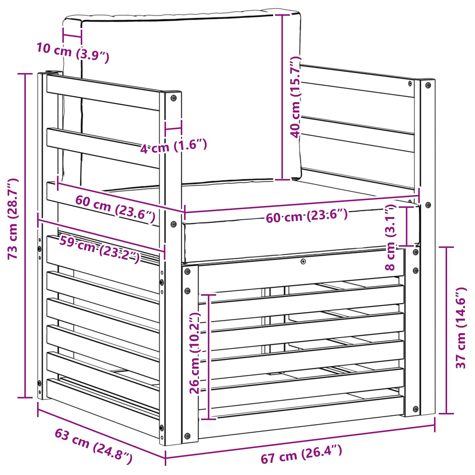 • 1 x Sedací polštář: 60 x 60 x 8 cm (D x Š x V)