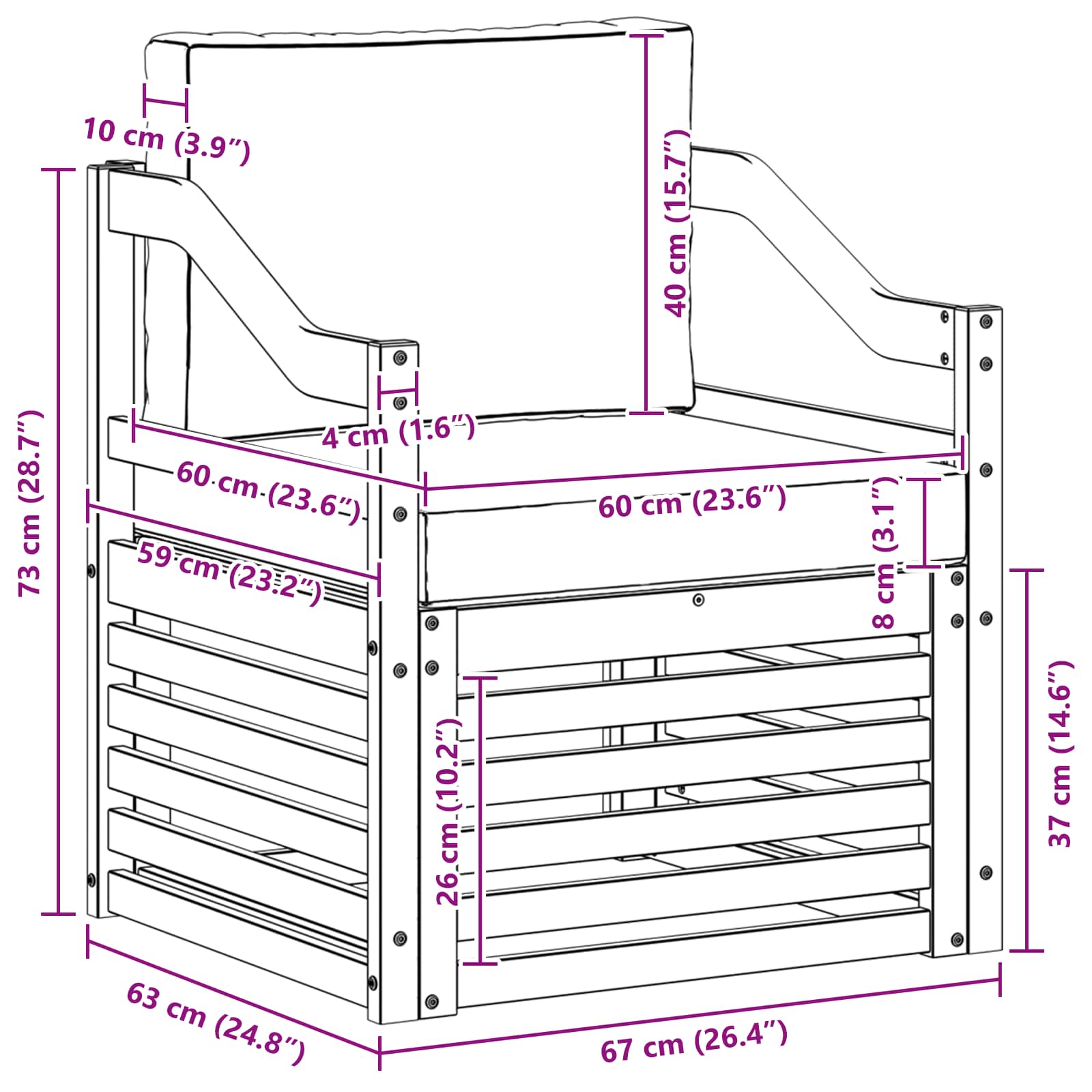 • 1 x Sedací polštář: 60 x 60 x 8 cm (D x Š x V)