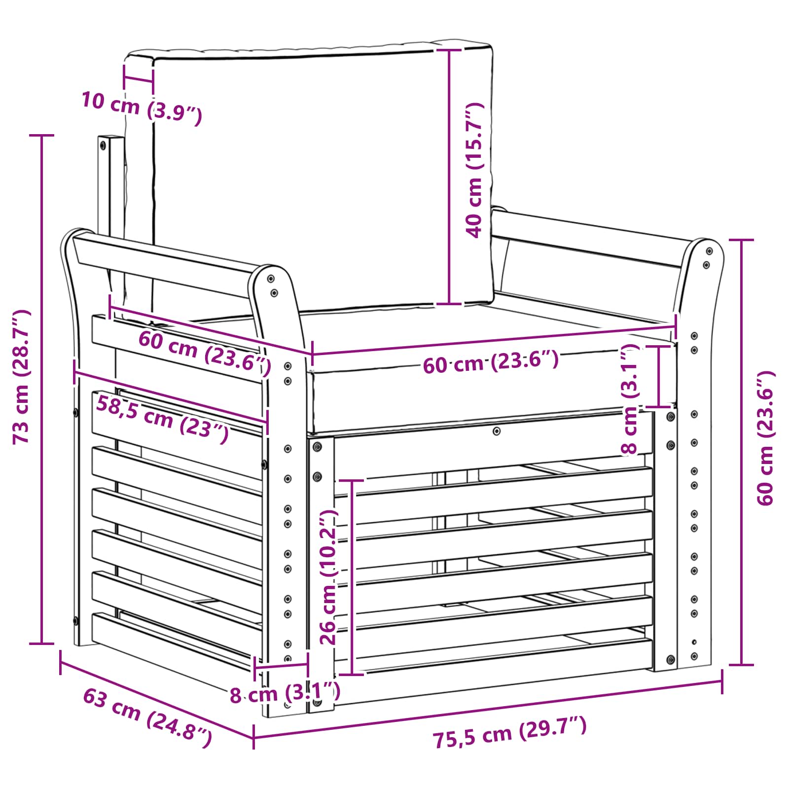 • 1 x Sedací polštář: 60 x 60 x 8 cm (D x Š x V)