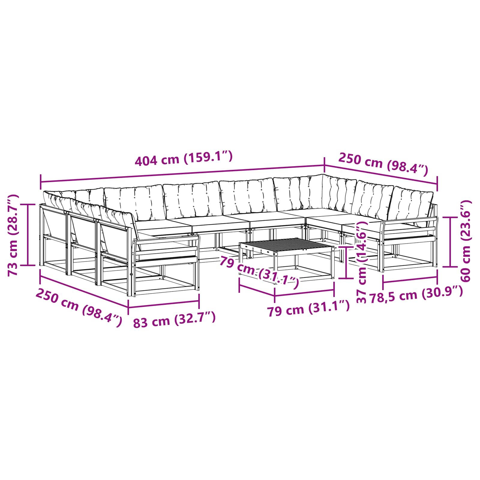 • 7 x Střední pohovka: 79 x 83 x 73 cm (D x Š x V)