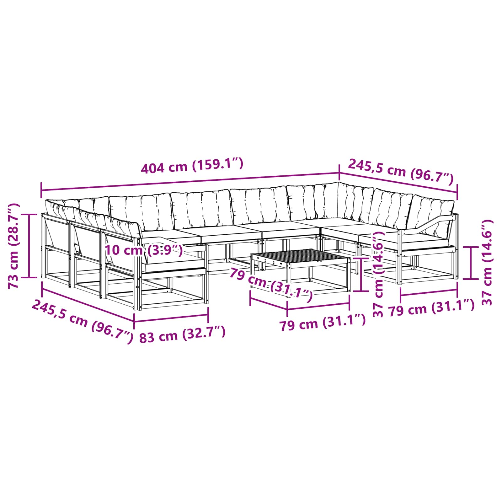 • 7 x Prostřední pohovka: 79 x 83 x 73 cm (D x Š x V)