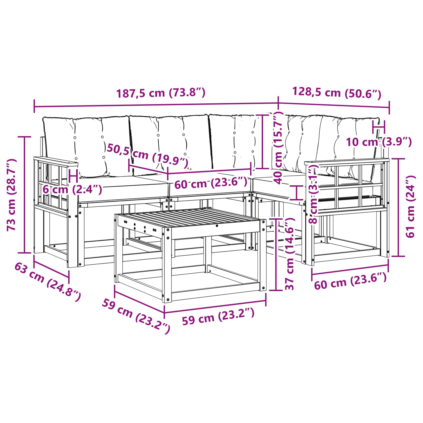 • 1 x Rohová pohovka: 63 x 63 x 73 cm (D x Š x V)