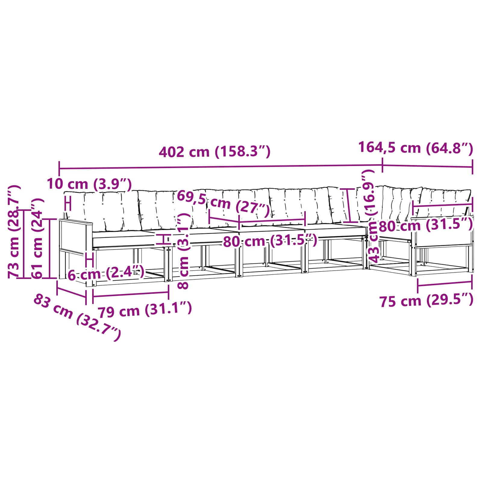 • 7 x zadní polštář: 80 x 43 x 10 cm (D x Š x T)