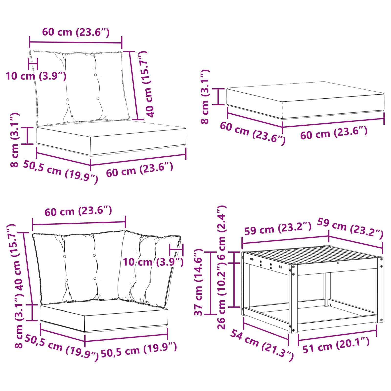 • 1 x Sedák: 60 x 60 x 8 cm (D x Š x V)