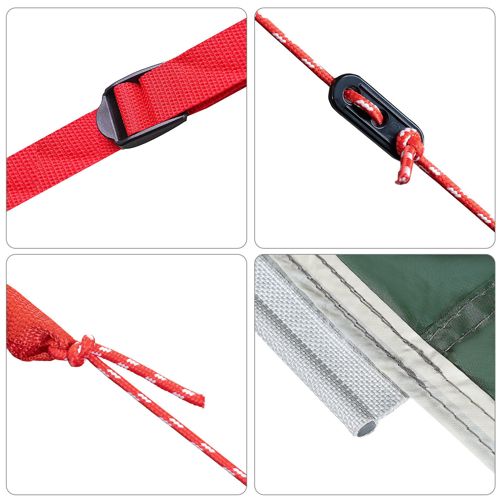 • Odolné materiály: Vyrobeno z kvalitního polyesteru a vyztuženo sklolaminátem, tento tarp slibuje spolehlivý výkon a dlouhou životnost. Tato konstrukce zajišťuje, že tarp je odolný proti trhání, a tím poskytuje nepřetržitou ochranu i po intenzivním používání. Kromě toho jsou tyto materiály vybrány pro svou schopnost odolávat různým podmínkám venku, což nabízí maximální ochranu a všestrannost.