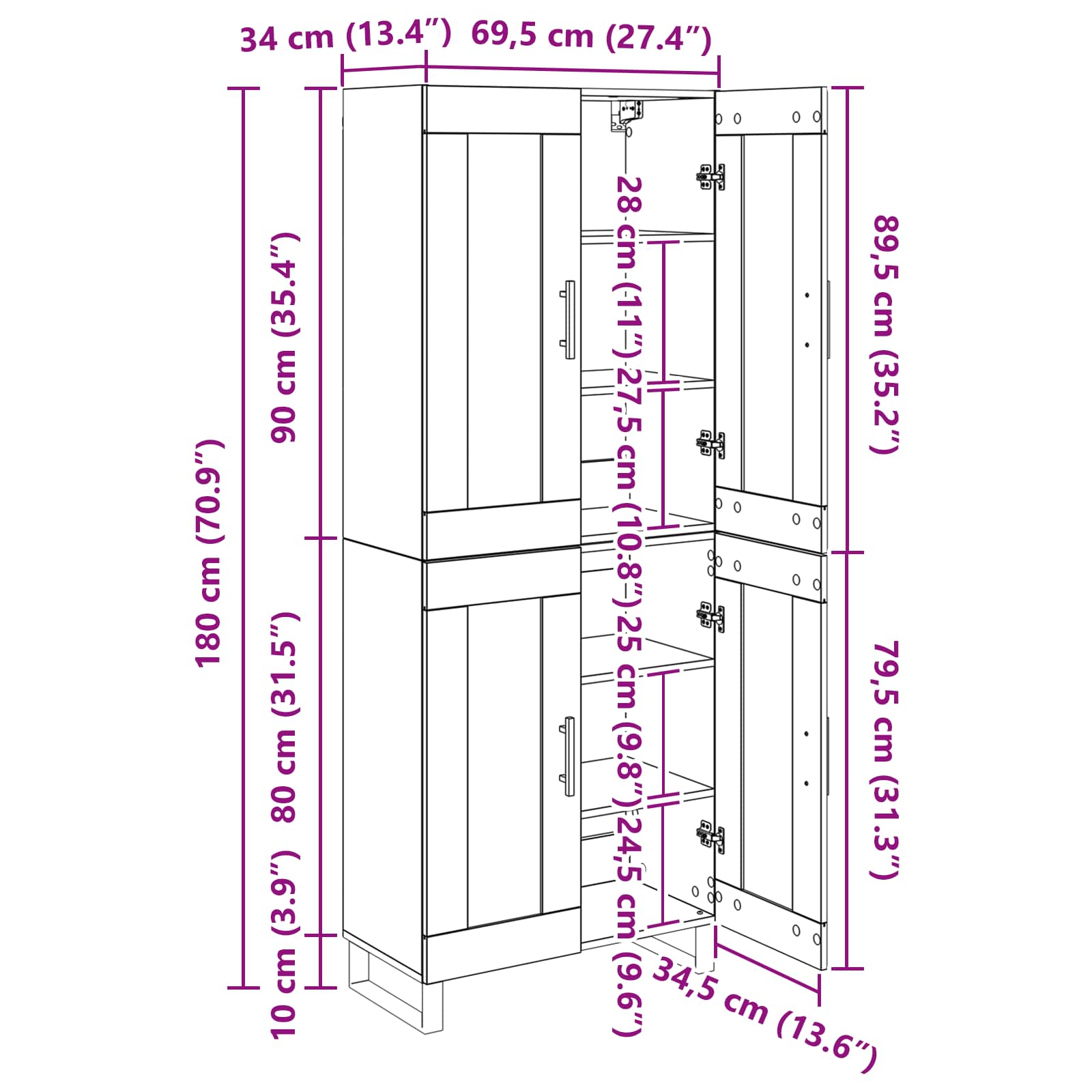 • 1 x Vrchní deska pro vysokou skříň: 69,5 x 34 x 90 cm(DxŠxV)