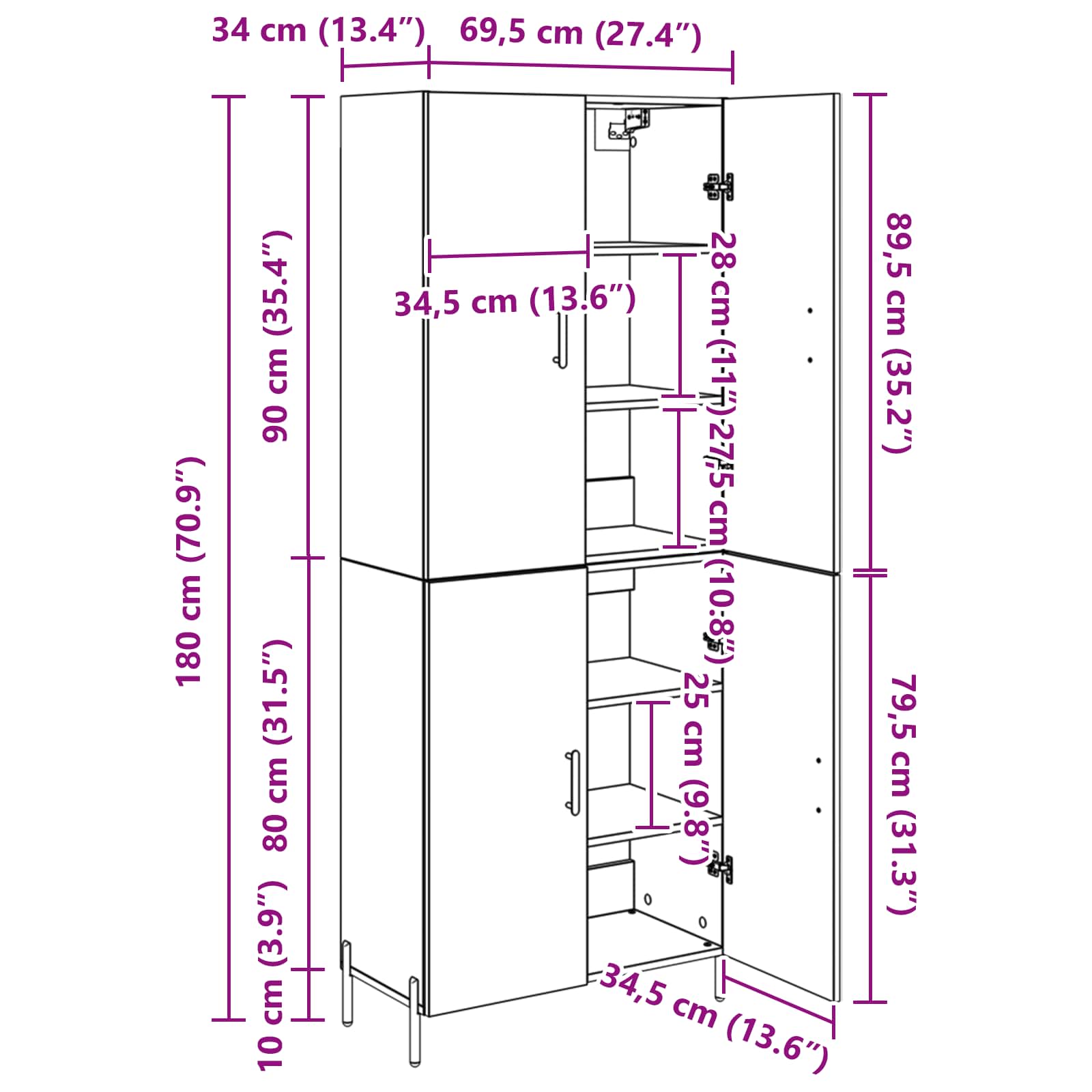 • 1 x Vrchní díl pro vysokou skříň: 69,5 x 34 x 90 cm