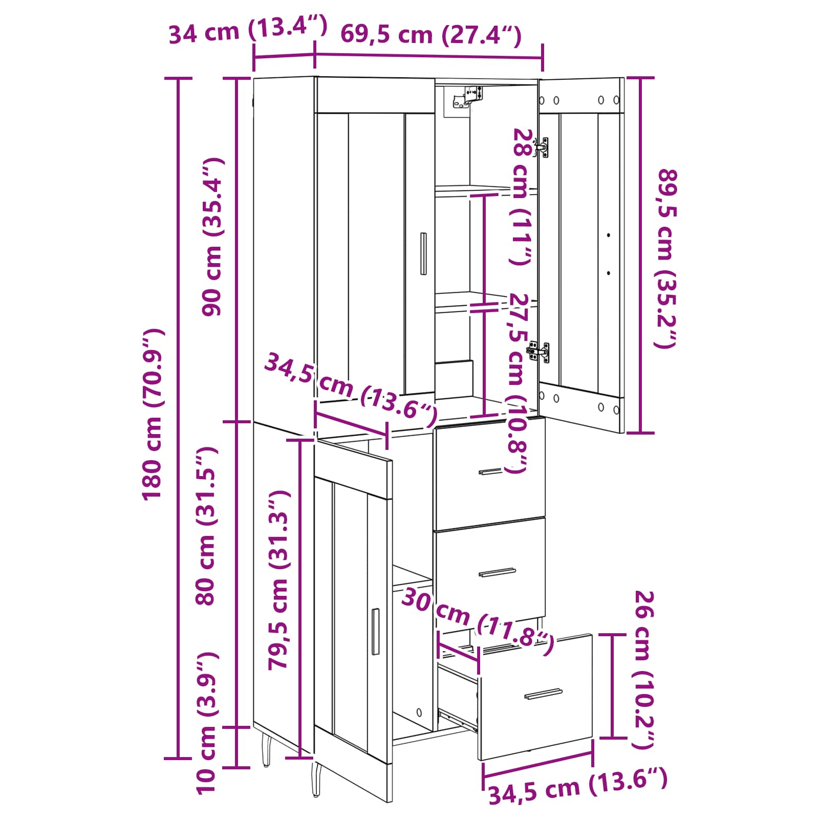 • 1 x vrchní část pro vysokou komodu: 69,5 x 34 x 90 cm (D x Š x V)