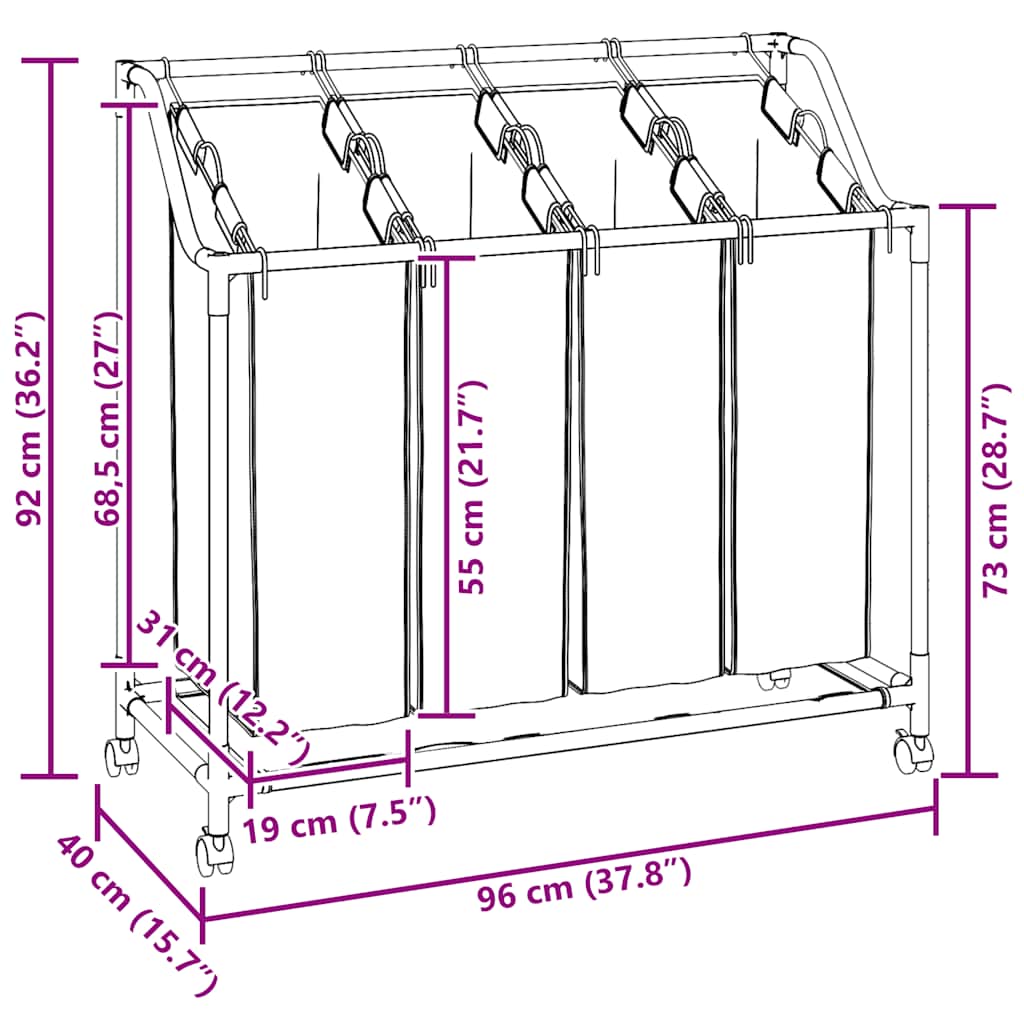 Tento koš na prádlo se 4 koši na třídění prádla umožňuje, aby jste mohli vaše bílé, barevné, tmavé a jemné prádlo oddělit nebo roztřídit prádlo, které je běžně znečištěné od prádla, které je velmi znečištěné. Koš má 4 velké koše na prádlo, které se dají snadno vyjmout pomocí pevných ocelových držadel.