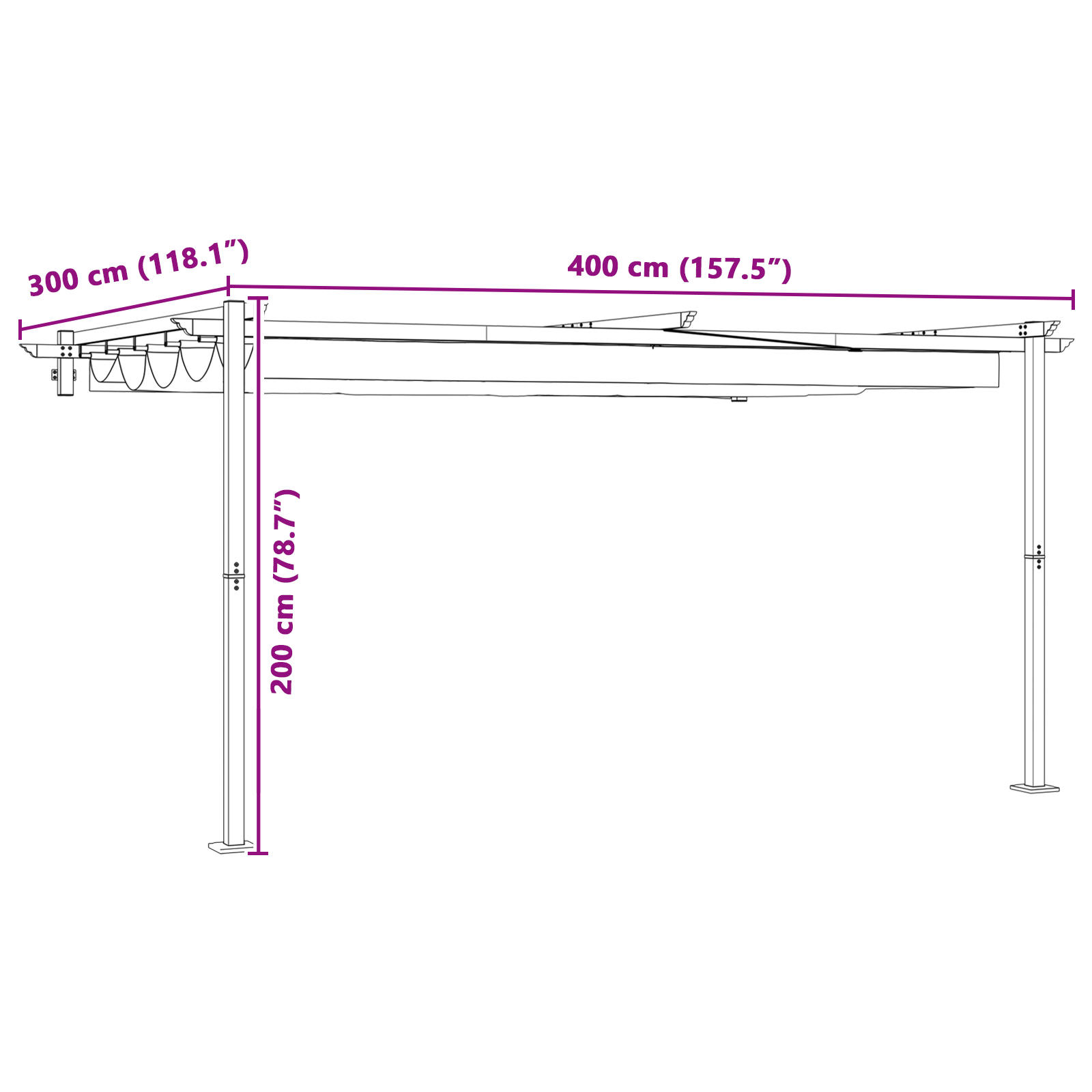 Nástěnný altán s roztažitelnou střechou nabízí moderní estetiku, která je perfektní pro každou zahradu nebo terasu. Kombinující styl s praktičností, tento altán poskytuje univerzální stinný úkryt pro rodinná setkání nebo tichou relaxaci. Jeho minimalistická forma a robustní materiály zajišťují, že doplní moderní venkovní prostory, vylepšující jak krásu exteriéru vašeho domova, tak venkovní funkčnost.