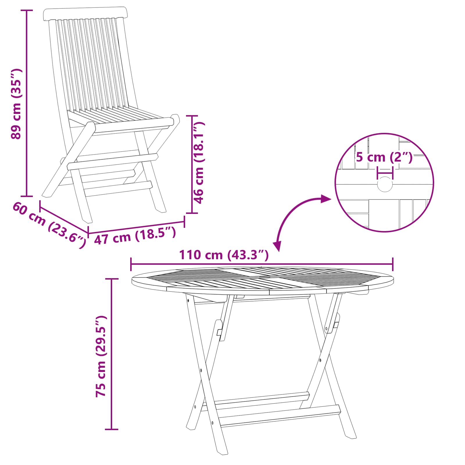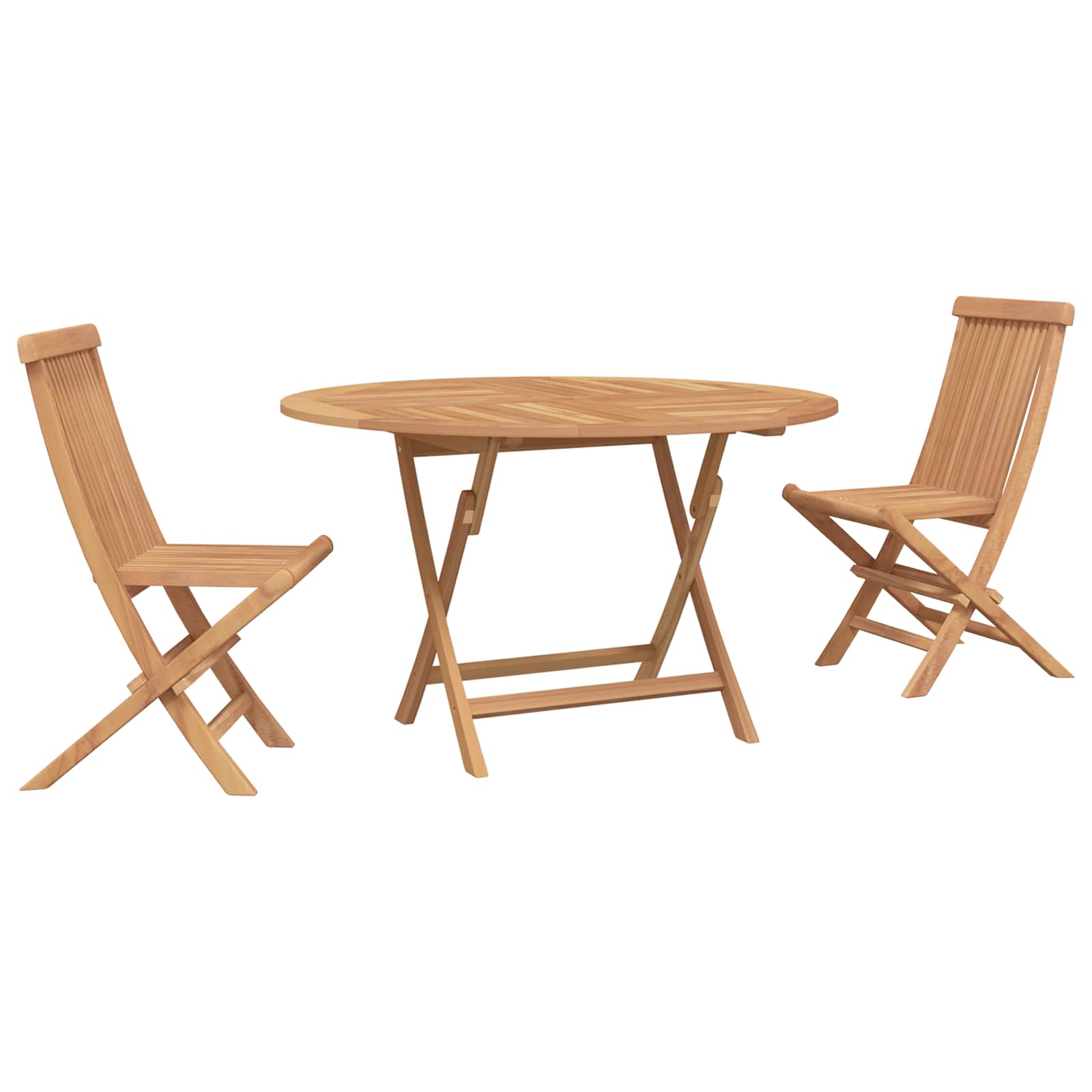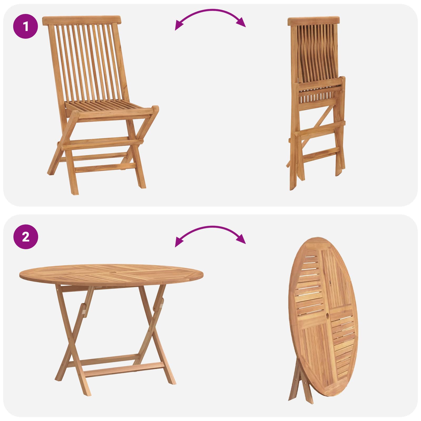 Tato zahradní souprava vyrobena z masivního teakového dřeva zahrnuje skládací stůl a židle, ideální do zahrady, na terasu nebo na dvůr. Latková konstrukce pomáhá s odváděním vody, a uprostřed je otvor na slunečník. Perfektní pro setkání s přáteli nebo běžné používání, skládací design umožňuje snadné uložení, když není potřeba.