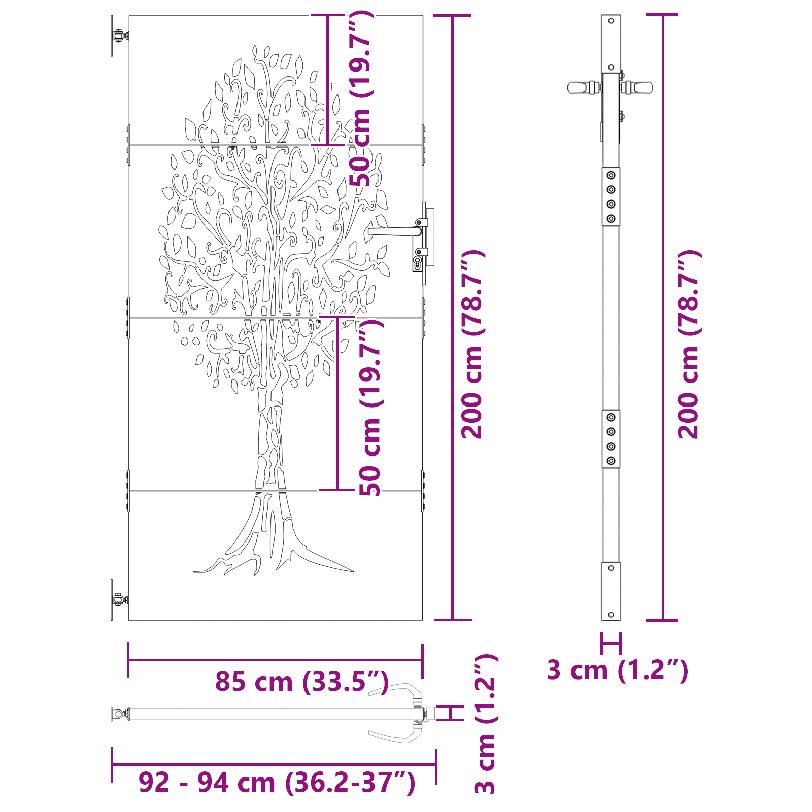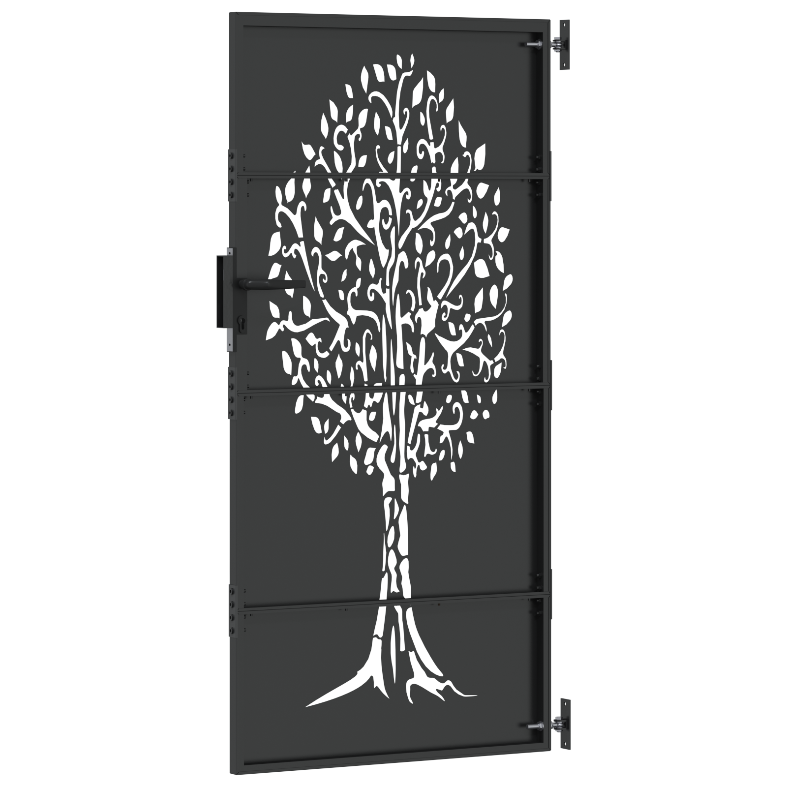Tato zahradní brána je skvělý doplněk do jakéhokoli venkovního prostoru, spojuje funkčnost a styl. Navržená pro venkovní použití, má moderní vzhled s jednoduchými liniemi a málo zdobení. Její tvar obdélníku s unikátním laserem vyřezávaným vzorem stromu vytváří působivý prvek a zároveň bezpečnostní opatření. Ideální pro zahrady a terasy, brána zajišťuje krásu a bezpečnost.