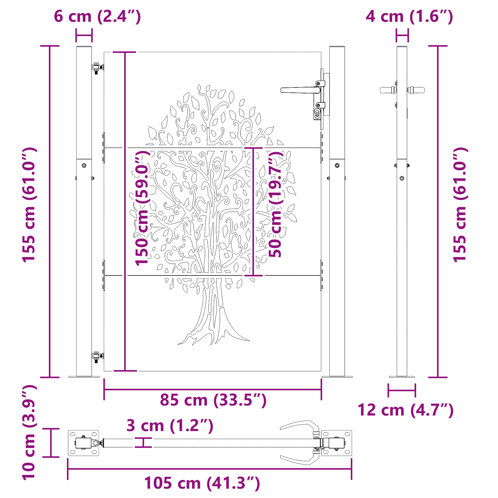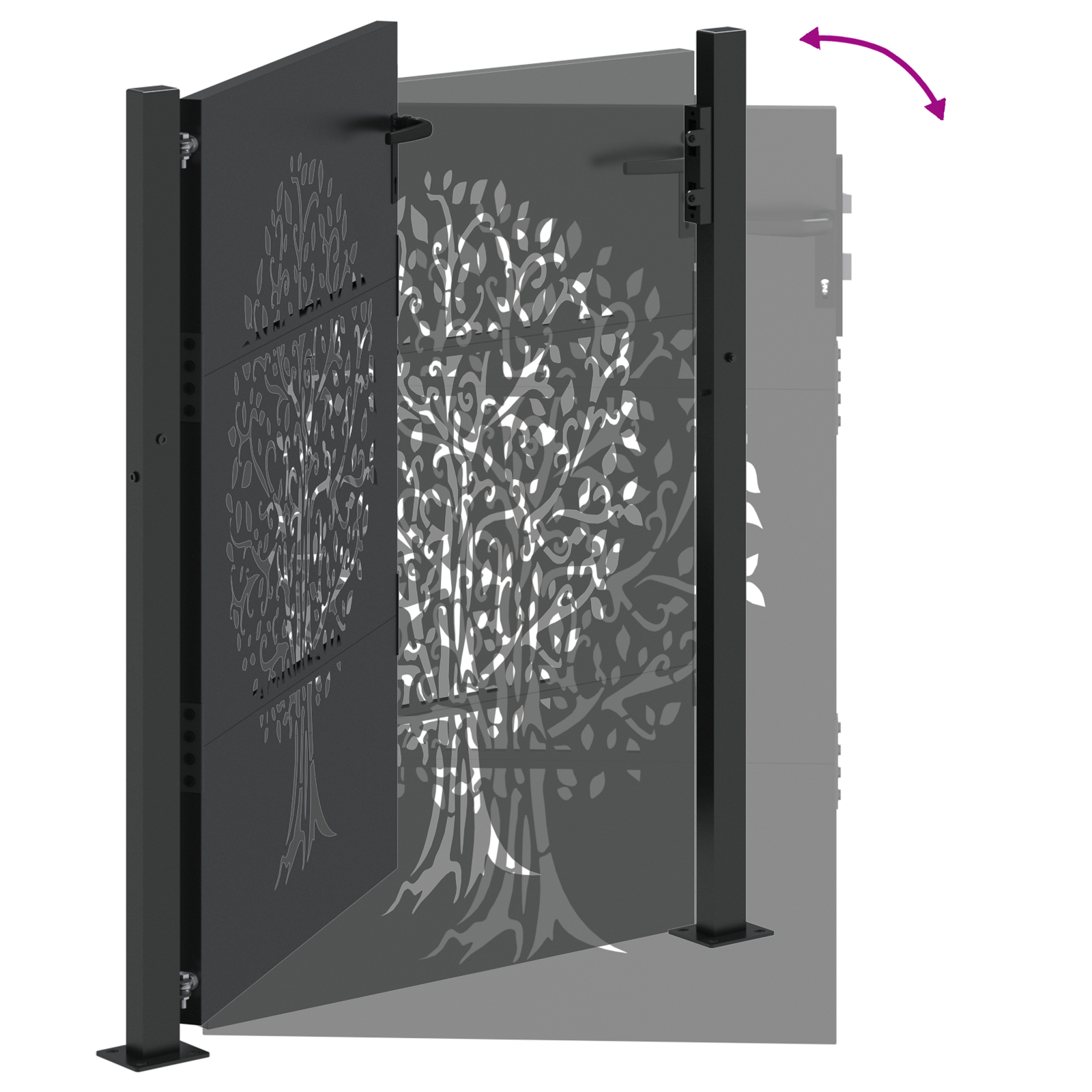 Tahle kovová zahradní brána je moderní a stylová, má skvělý design, čisté linie a minimální ozdoby, ideální pro zlepšení vzhledu jakékoli zahrady nebo terasy. Je vyrobená z práškově lakované oceli, takže se může pochlubit dlouhou životností a je perfektní pro jaro a léto. Stylový laserem vyřezávaný vzor stromu dodává umělecký prvek, který se snadno integruje s okolní krajinou, a nabízí praktickou funkčnost a bezpečnost pro venkovní prostory.