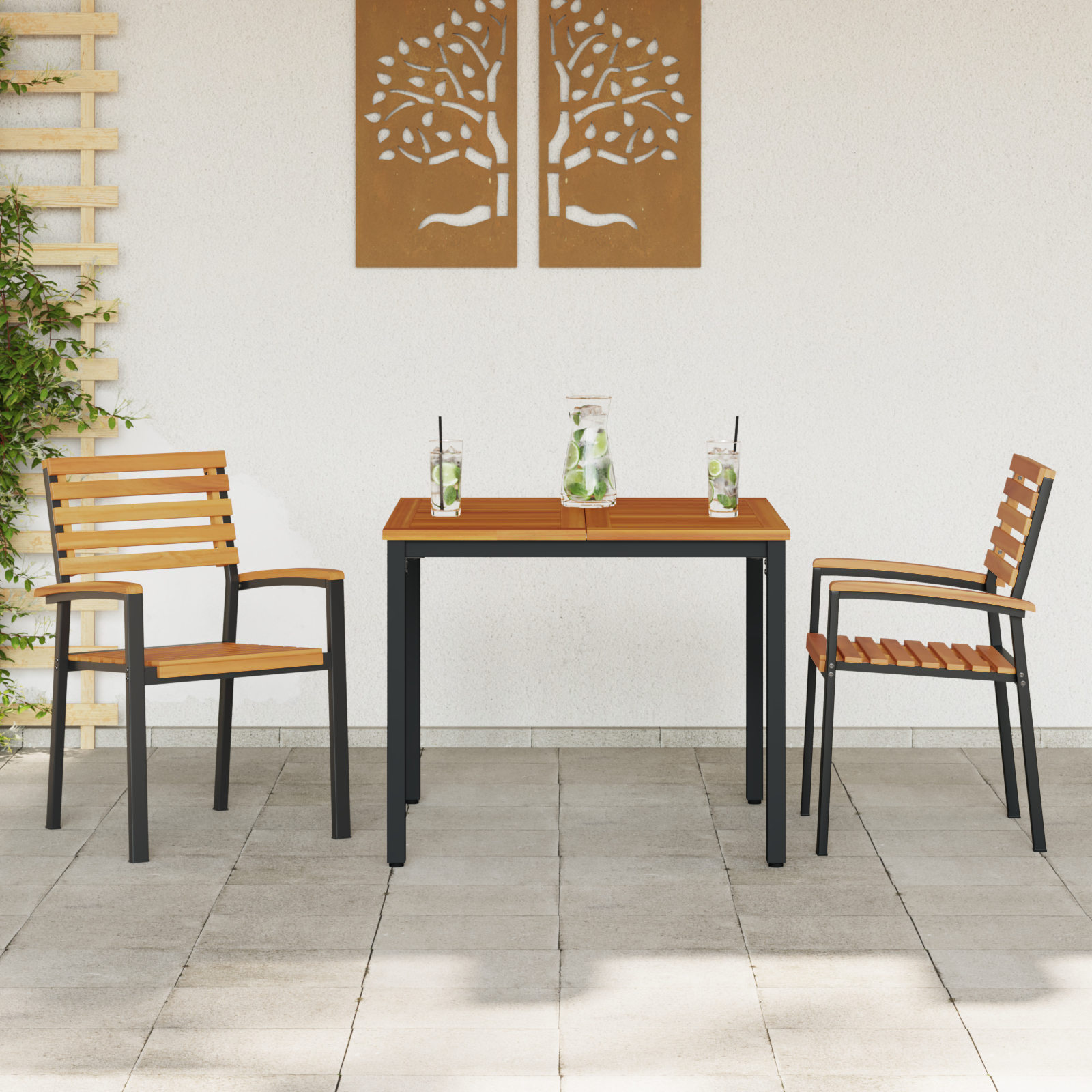 • Materiály: Tento zahradní jídelní set spojuje masivní akáciové dřevo s ocelí, což dává skvělou rovnováhu pro eleganci a stabilitu. Akácie je super odolná a má hezkou strukturu, skvěle doplňuje exteriér. Ocelová konstrukce je pevná a zajišťuje dlouhvěkost.
