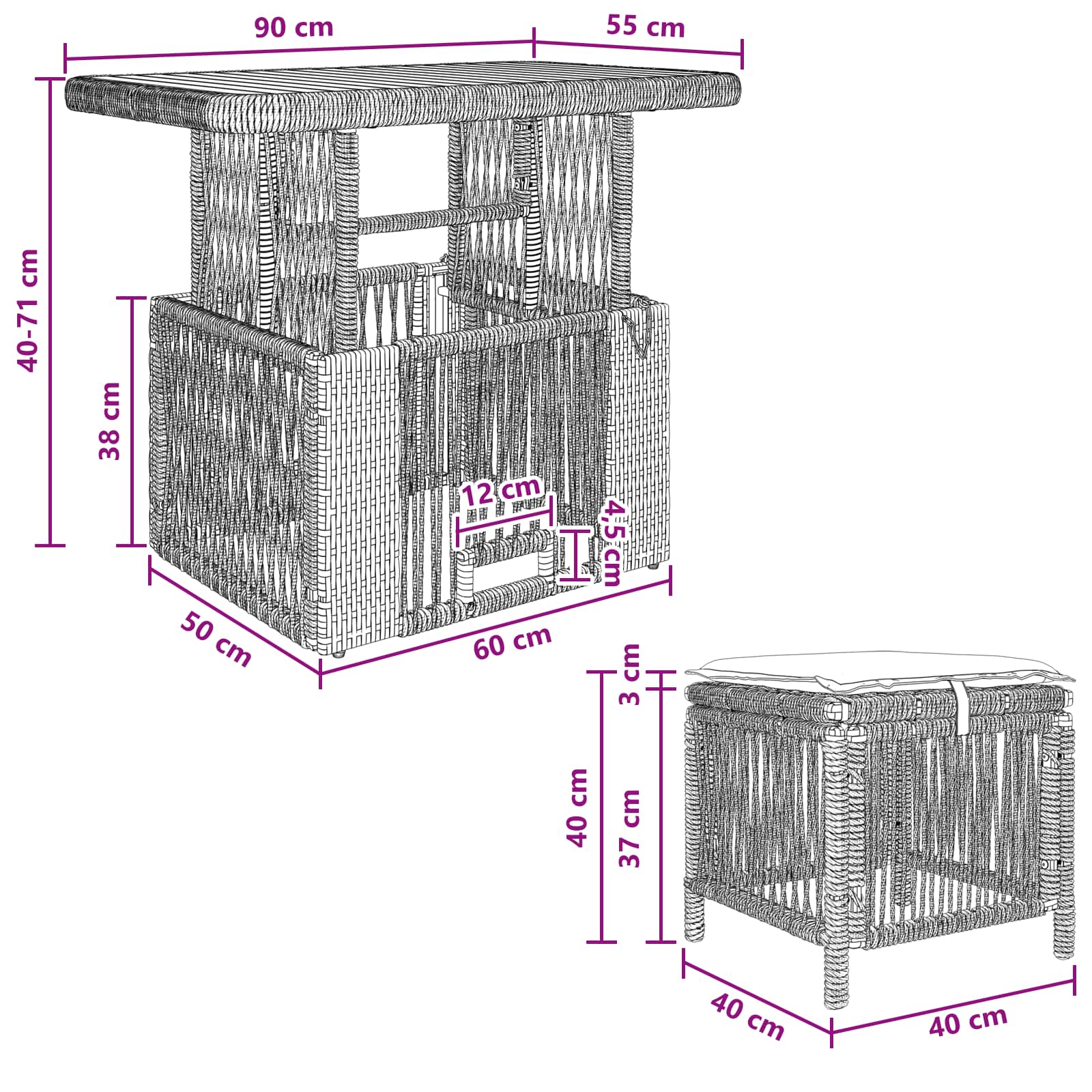 • Univerzální použití: Tato souprava je skvělá pro různé venkovní prostory jako zahrady, terasy, balkony a dvorky. Její styl a kvalita ji činí ideální pro relaxaci, stolování nebo společenské akce, přidávající pohodlí a funkčnost kamkoli ji postavíš.