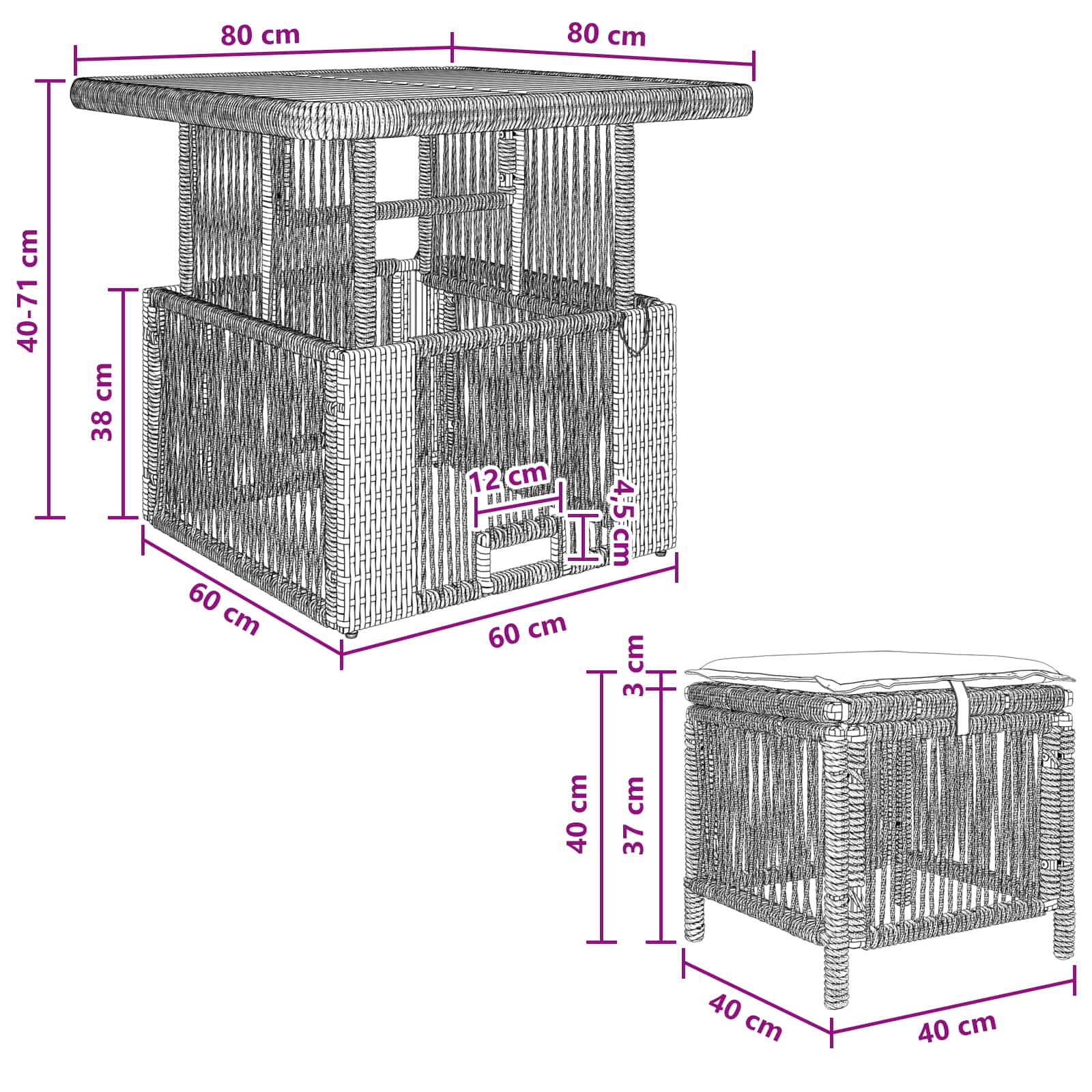 • 1 x Stůl: 80 x 80 x 71 cm (D x Š x V)