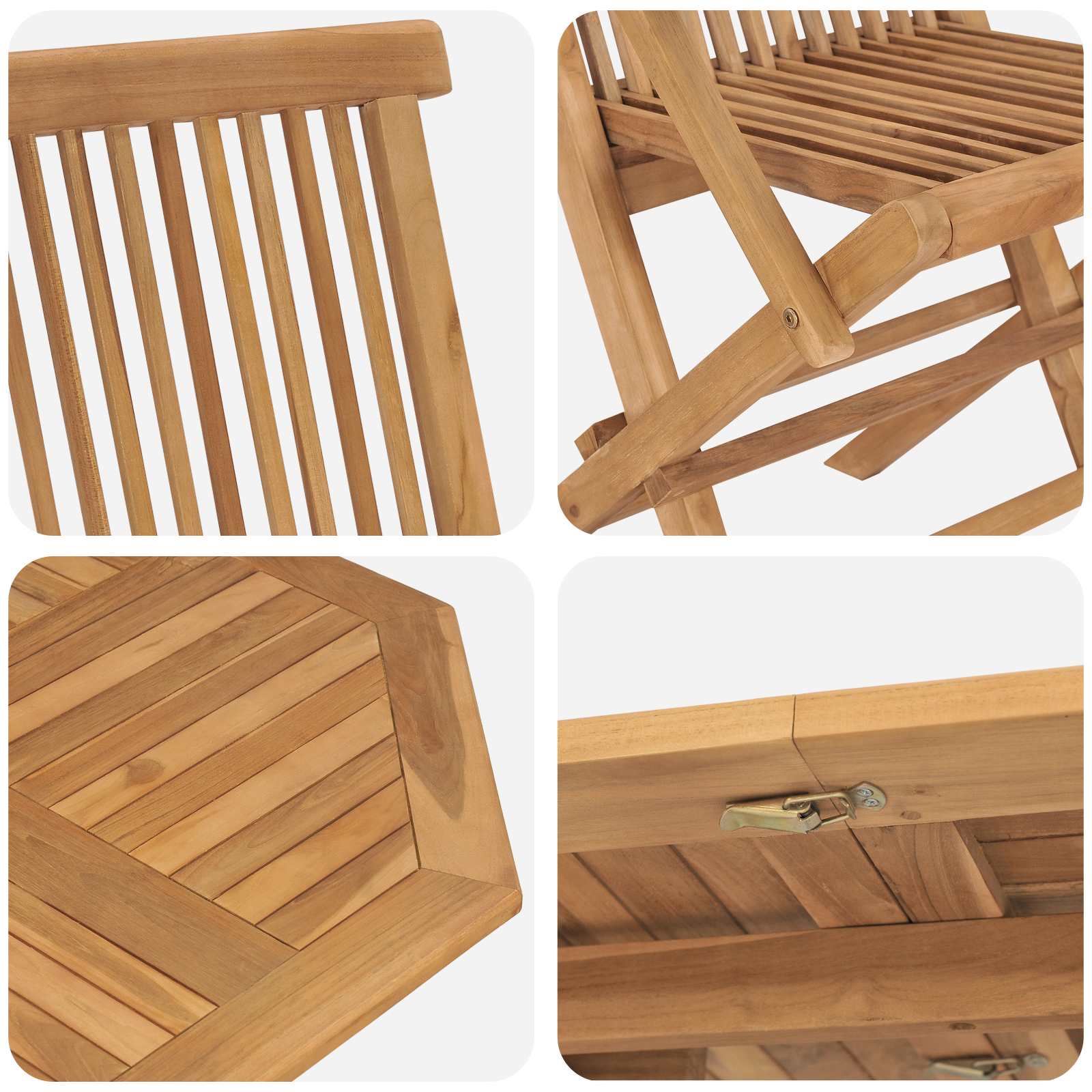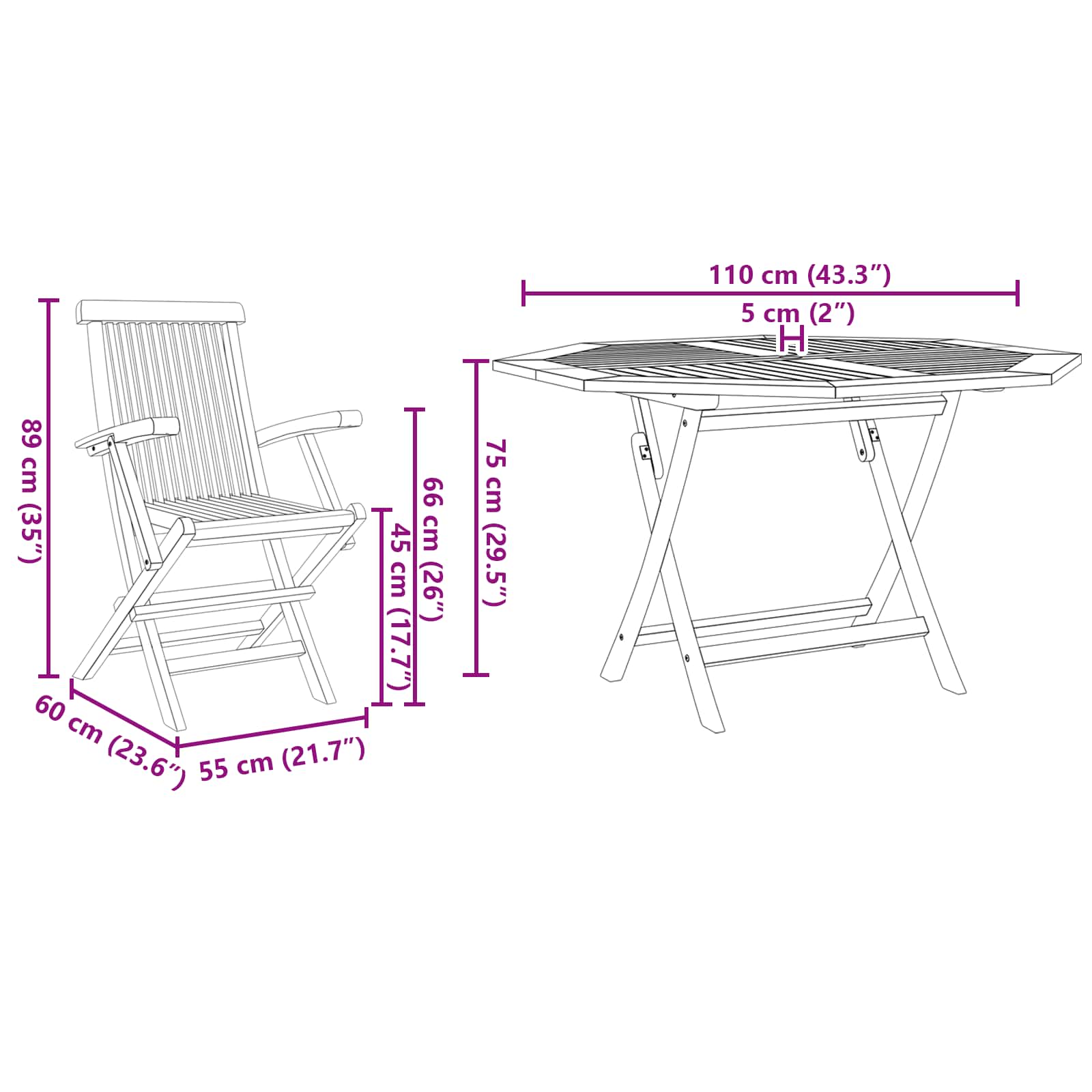 • Prémiové teakové materiály: Tenhle jídelní set je z masivního teakového dřeva, známého svou odolností a krásou. Odolává venkovnímu počasí, takže je perfektní pro dlouhodobé používání venku. Hluboká hnědá povrchová úprava ladí s různým venkovním dekorem a zajišťuje, že vypadá skvěle i s postupem času.