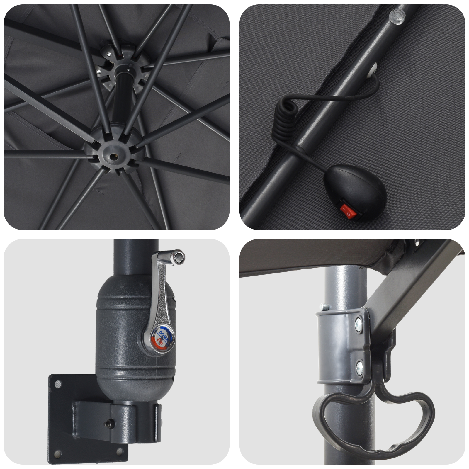 • LED osvětlení Užijte si své večery venku s integrovanými LED světly pod slunečníkem. Solární nebo na baterie, osvětlení zajišťuje příjemnou atmosféru, díky které zůstanete venku déle.