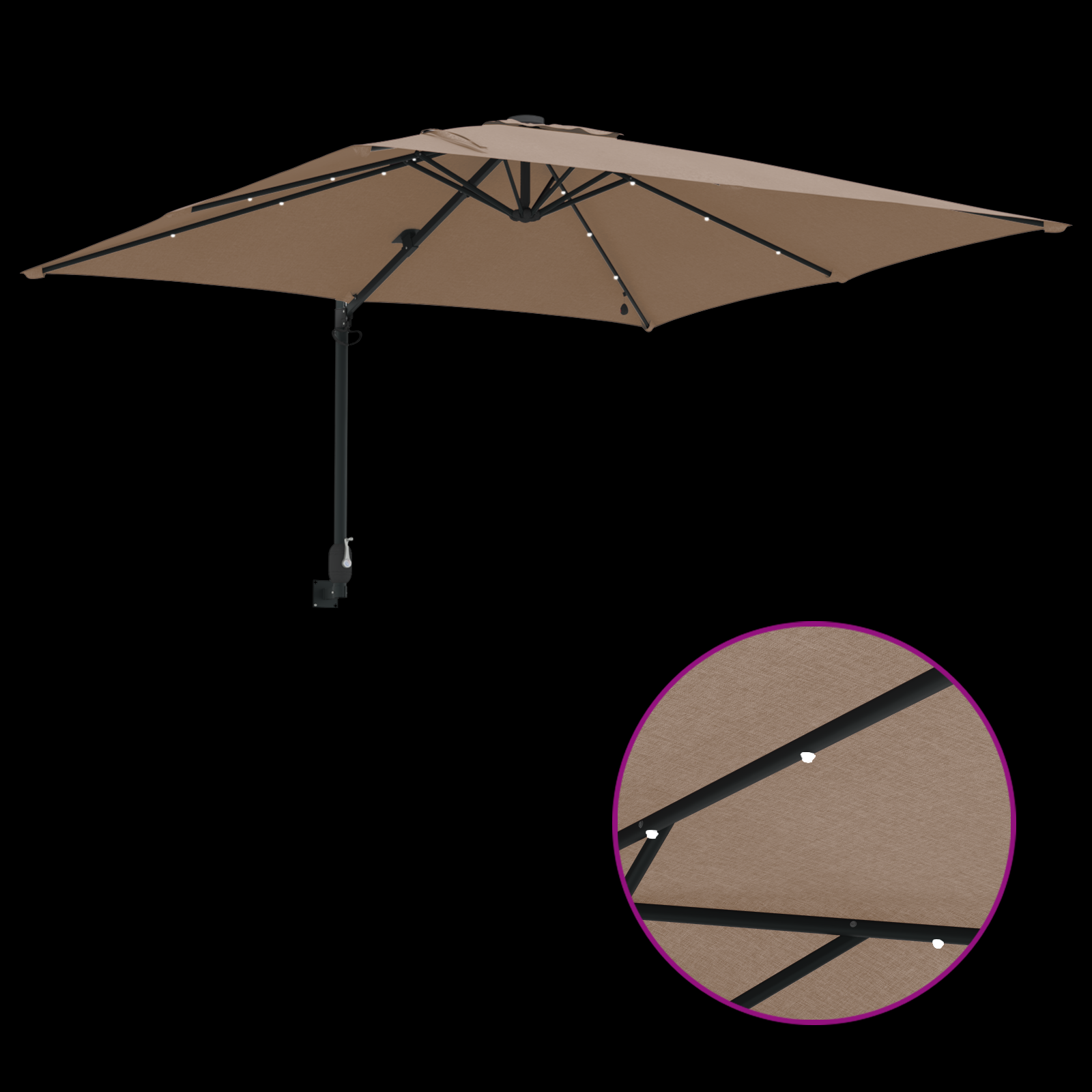 • LED osvětlení Užijte si své večery venku s integrovanými LED světly pod slunečníkem. Solární nebo na baterie, osvětlení zajišťuje příjemnou atmosféru, díky které zůstanete venku déle.