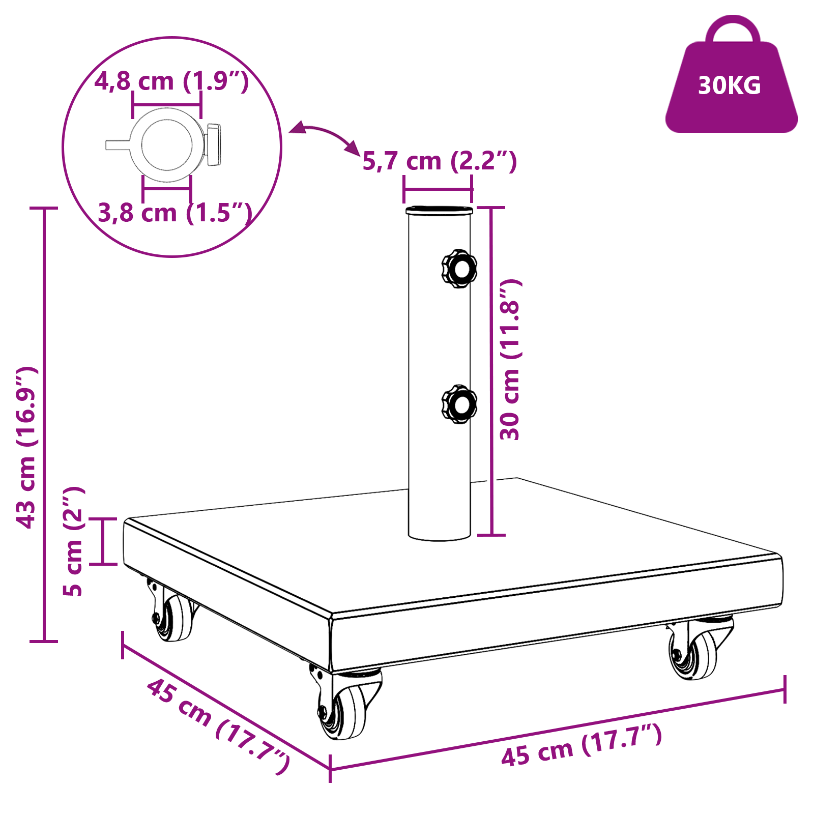 Tento slunečníkový základ je jednoduchý a šikovný. Vyrobený z odolné žuly, jde ruku v ruce s moderním stylem a přizpůsobí se každému venkovnímu uspořádání. Čtvercový design je vyvážený a ladí s minimalistickými prostory. Je ideální pro větší slunečníky, takže se nemusíte bát nepříznivého počasí, budete mít klid při odpočinku nebo pořádání akcí na terase.