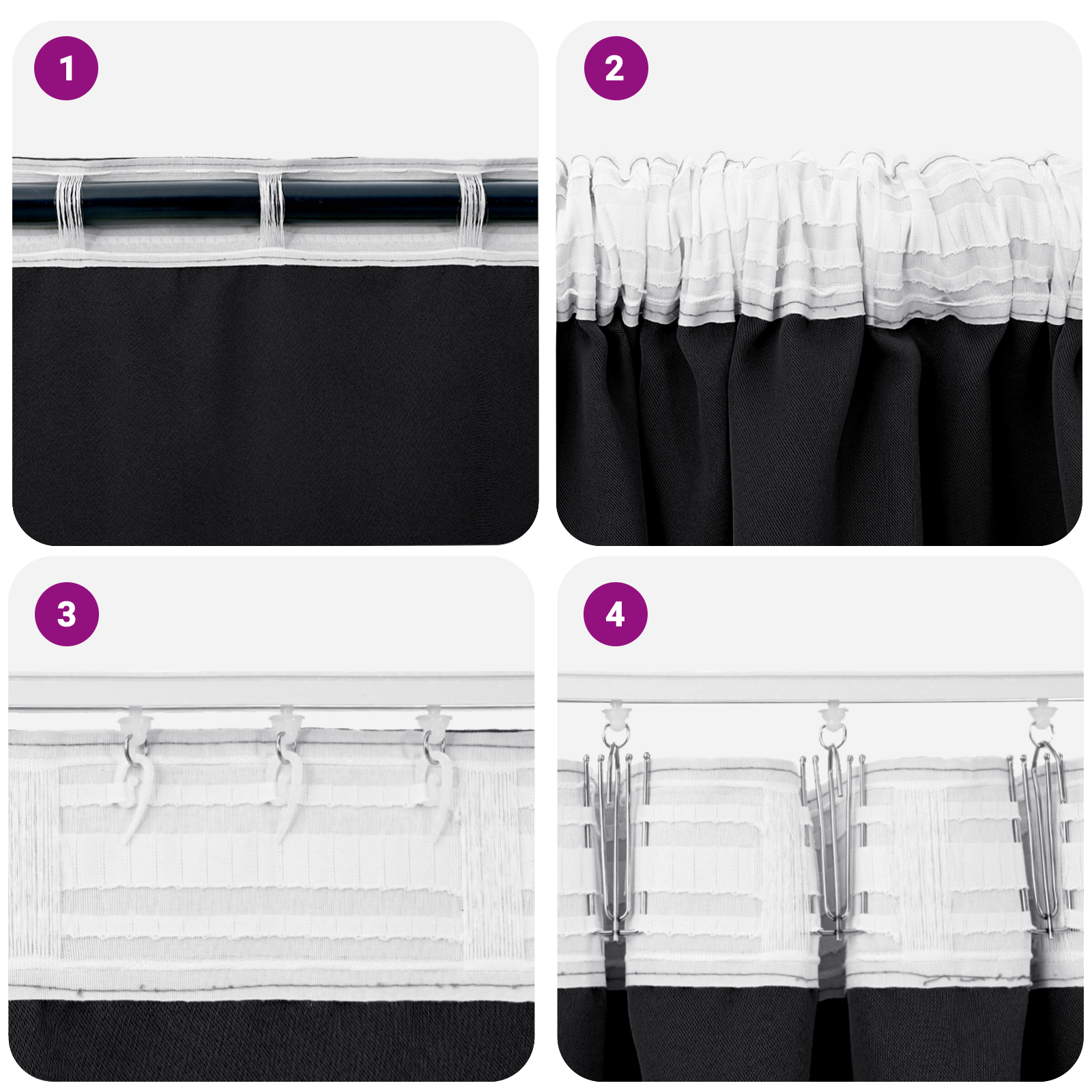 • Univerzální možnosti zavěšení: Závěsy můžete snadno pověsit pomocí malých háčků, velkých háčků, poutka nebo kapsy na tyč podle vlastní volby. Tato univerzálnost usnadňuje přizpůsobení různým tyčím a stylům oken.