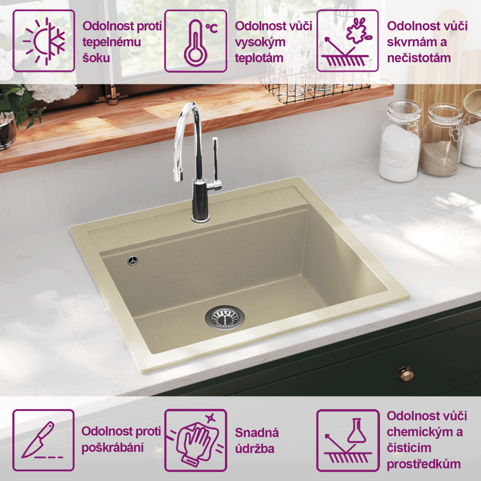 Dřez je zhotoven z vysoce kvalitní žuly, výborně tedy odolává teplu, poškrábání a nárazům a snadno se čistí. Součástí balení je i sítko na odpad pro jednodušší odstraňování nečistot.